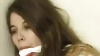 يتم ربط امرأة سمراء مكممة بالطريقة التي تحبها أكثر ، لأنها تثيرها أكثر.